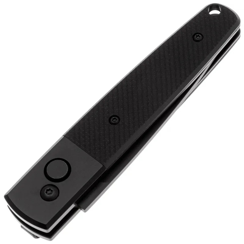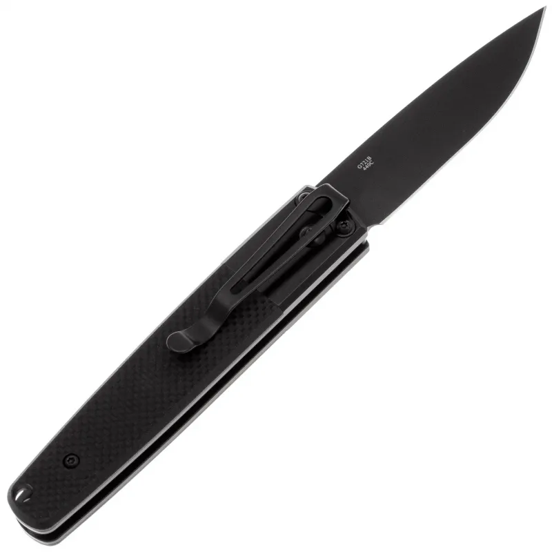 Клинок ножа имеет форму Drop-Point, что обеспечивает идеальный баланс между прочностью и универсальностью. Клинок выполнен из стали 440C, которая славится хорошей коррозионной стойкостью и оптимальной твёрдостью. Высокое содержание хрома в стали обеспечивает отличное сопротивление ржавчине и позволяет легко поддерживать остроту. Покрытие черного цвета придает ножу элегантный и строгий вид. Одной из выдающихся особенностей ножа является система автоматического раскрытия клинка, активируемая кнопкой. Эта функция гарантирует быстрое открытие ножа, фиксируя клинок как в открытом, так и в закрытом положении, что придаёт ему дополнительную функциональность и безопасность.