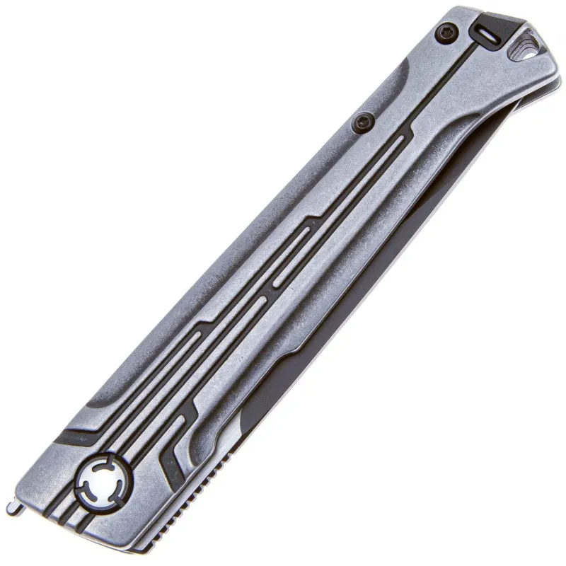 Рукоятка изготовлена из стали. Достаточно популярный материал для изготовления рукоятей. Он простой и дешевый в производстве, при этом хорошо сопротивляется коррозии и обладает высокой прочностью, но, в отличии от титана или алюминия, имеет большой вес, что может быть критично для складных ножей.