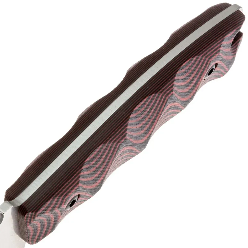 Рукоять изготовлена из G10 — многослойного стеклотекстолита с эффектной 3D-обработкой. Этот материал отличается высокой износостойкостью, термостойкостью и отличной цепкостью даже во влажной среде. Яркий и агрессивный рельеф усиливает хват и подчёркивает тактический характер ножа. Рукоять надёжно зафиксирована на хвостовике, хорошо сбалансирована по весу, не скользит и удобно ложится в ладонь. В конструкции предусмотрено отверстие под темляк — полезная мелочь для полевого использования или кастомизации. Клипса отсутствует, что оправдано при таком форм-факторе.
