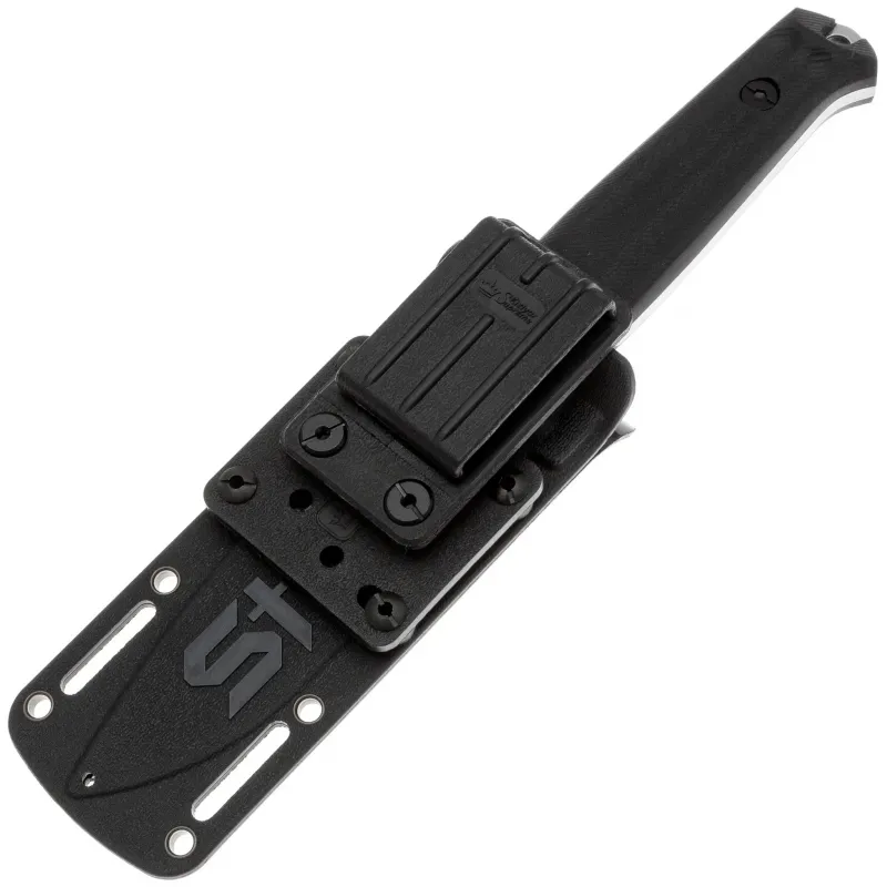 В комплекте идут пластиковые ножны, обеспечивающие практически бесшумное извлечение ножа. Переставляемая клипса с платформой позволяет удобно носить нож в разных положениях – на поясе, снаряжении или экипировке.