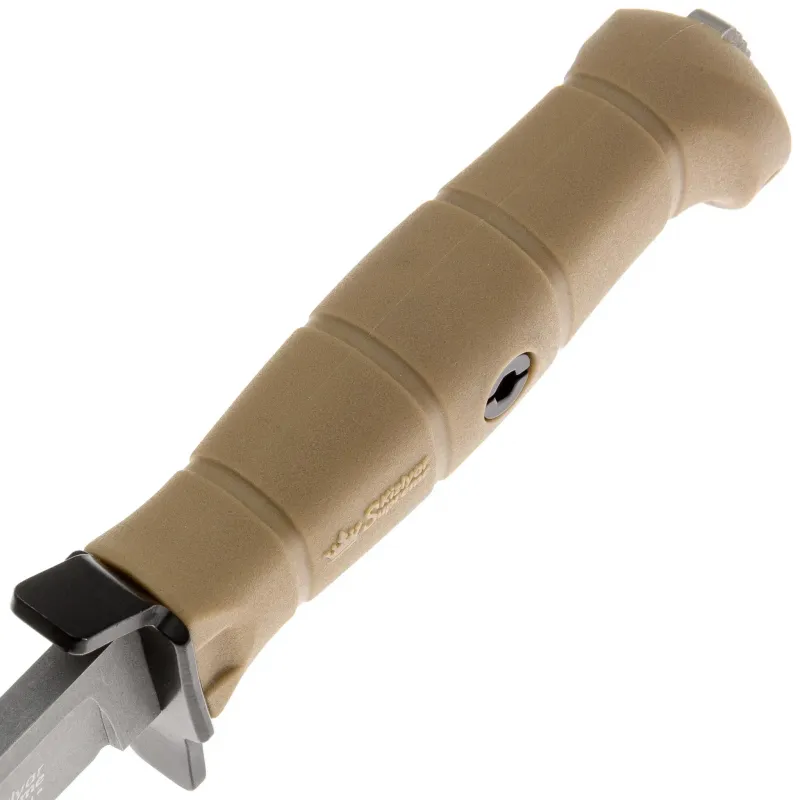 Нож имеет всадной монтаж - хвостовик проходит через всю рукоять и заканчивается стеклобоем. Сама рукоять выполнена из кратона, он не выскользнет из руки даже во время работы в перчатках. Также руки владельца защищает гарда. Кратон - это материал, аналог резины, но превосходит её по показателям термо- и износостойкости. Несколько «липковатая» поверхность и рифлёная текстура рукояти обеспечивают уверенный хват.