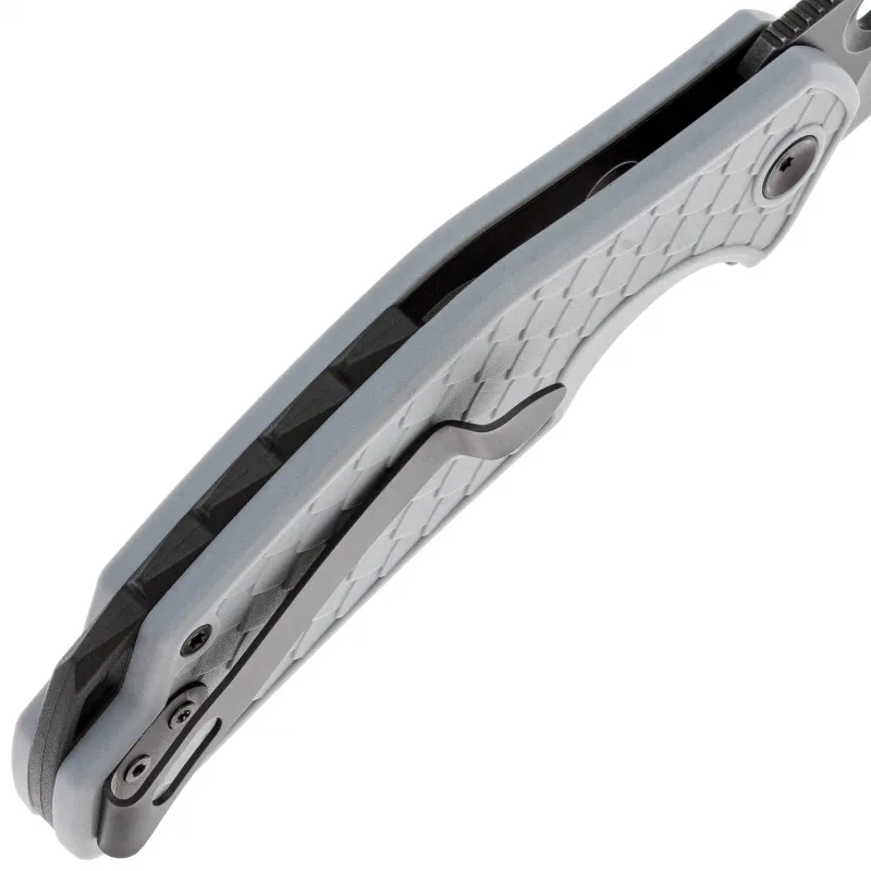 Рукоять и бекспейсер выполнены из прочного и легкого материала FRN, который отличается высокой устойчивостью к ударам и воздействию окружающей среды. Особенность дизайна рукояти — текстура, имитирующая драконью чешую, которая обеспечивает уверенный и комфортный хват. Насечки на спейсере, напоминающие спинной гребень, добавляют изделию оригинальности и подчеркивают драконий мотив. Эргономичная форма рукояти делает использование ножа удобным в любых условиях. Нож также оснащен клипсой, позволяющей удобно носить его в кармане, а также отверстием под темляк для дополнительной персонализации или удобства ношения.