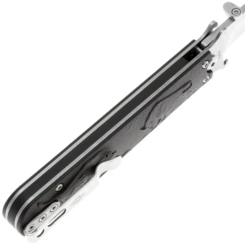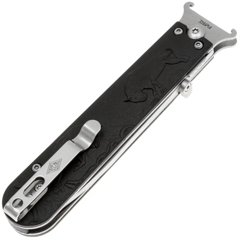 Рукоять изготовлена из армированного нейлона (FRN) — легкого, прочного и устойчивого к воздействию окружающей среды материала. Эргономичная форма рукояти обеспечивает надежный хват и комфорт при продолжительном использовании, а антискользящая текстура гарантирует уверенное удержание даже при мокрых руках. Нож оснащен переставляемой клипсой глубокой посадки для удобного крепления на кармане одежды.
