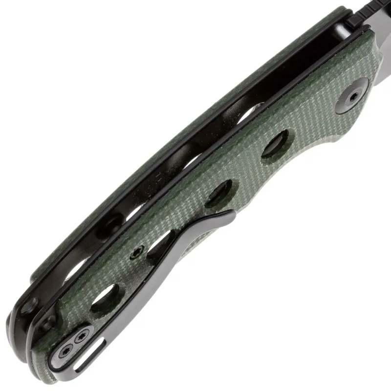 Рукоять ножа изготовлена из микарты. Микарта представляет собой композитный материал, состоящий из слоев ткани, пропитанных смолой, и прессованных под высоким давлением. Этот материал отличается высокой прочностью, устойчивостью к воздействию влаги и химических веществ, а также легкостью. Микарта обладает текстурированной поверхностью, что обеспечивает надежный и комфортный хват, предотвращая скольжение даже в условиях повышенной влажности. Эргономичная форма рукояти идеально ложится в руку, обеспечивая удобство и минимизируя усталость при длительном использовании. Рукоять также оснащена клипсой, что позволяет удобно носить нож в кармане или на поясе.