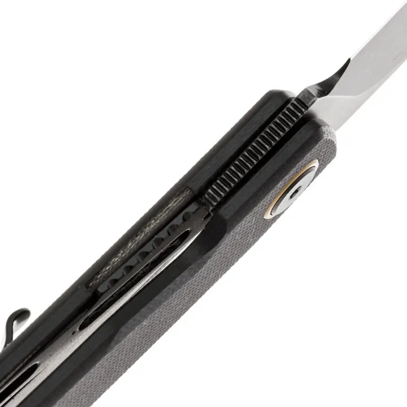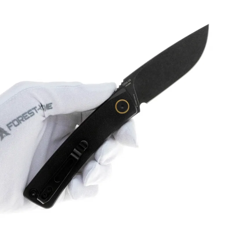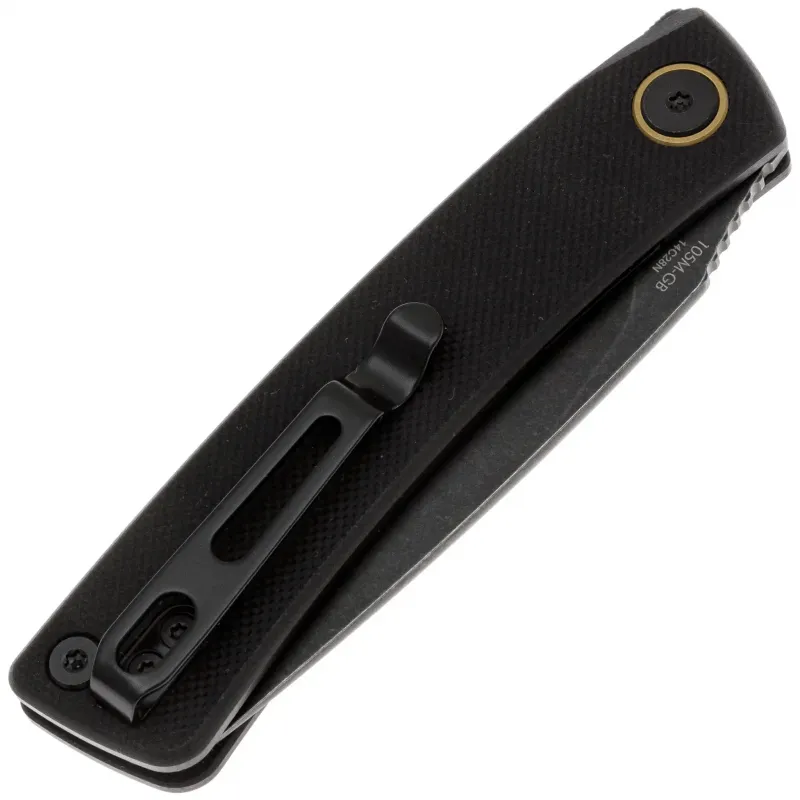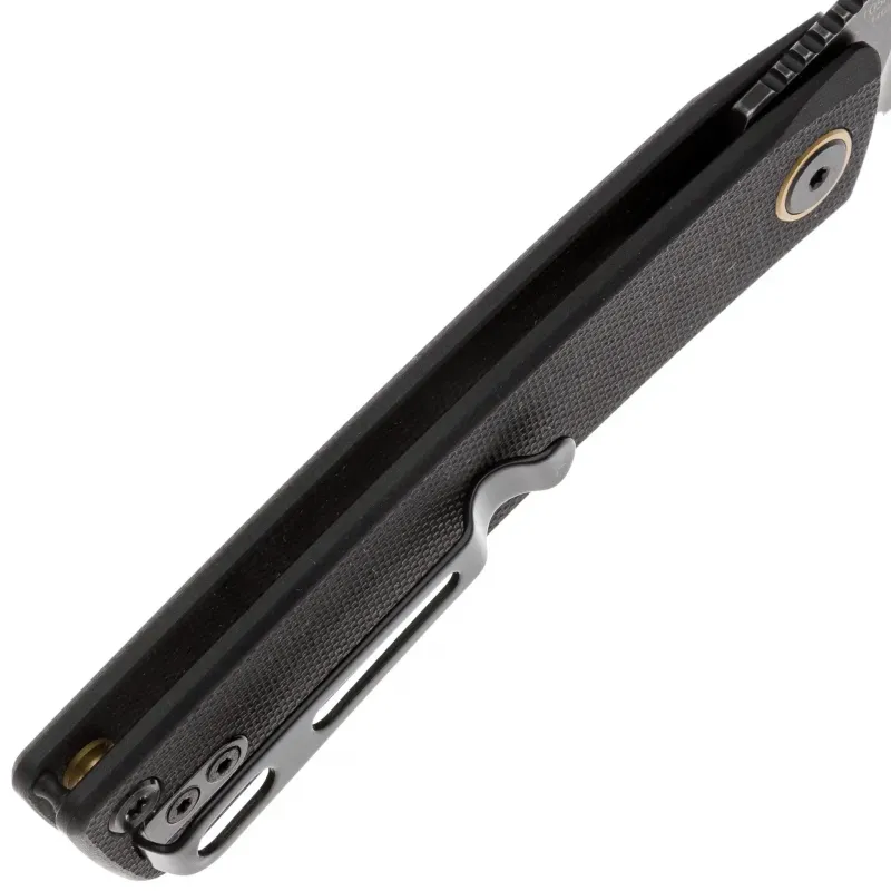 Рукоять выполнена из прочного композитного материала G10 черного цвета — легкого, износостойкого и практичного материала, который обеспечивает оптимальный баланс между весом и прочностью. Эргономичная слегка изогнутая форма рукояти гарантирует надежный хват и комфорт при длительном использовании. Материал G10 устойчив к влаге, перепадам температур и механическим повреждениям, а его текстурированная поверхность предотвращает скольжение даже в условиях повышенной влажности. Для удобства ношения нож оснащен реверсивной клипсой глубокой посадки, которую можно переставить как для правостороннего, так и для левостороннего крепления. Также предусмотрено темлячное отверстие для крепления страховочного шнура.