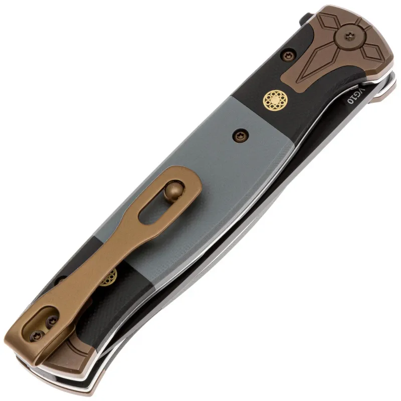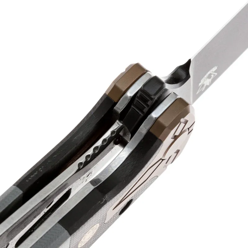 Клинок выполнен в популярной форме drop-point — универсальный профиль, подходящий для самых разных задач. Материал — проверенная временем японская сталь VG-10, хорошо сбалансированная по твёрдости, износостойкости и коррозионной стойкости. Она уверенно держит заточку, при этом не слишком капризна в правке. Единственный минус VG-10 — это возможная хрупкость при чрезмерных нагрузках, так что ломовые задачи лучше оставить другому инструменту. Клинок имеет чёрное покрытие, которое уменьшает блики и дополнительно защищает сталь от коррозии. Спуски на 2/3 высоты клинка. Для открытия используется флиппер. За фиксацию отвечает liner-lock — надёжный и проверенный механизм, который надёжно удерживает клинок в открытом положении.