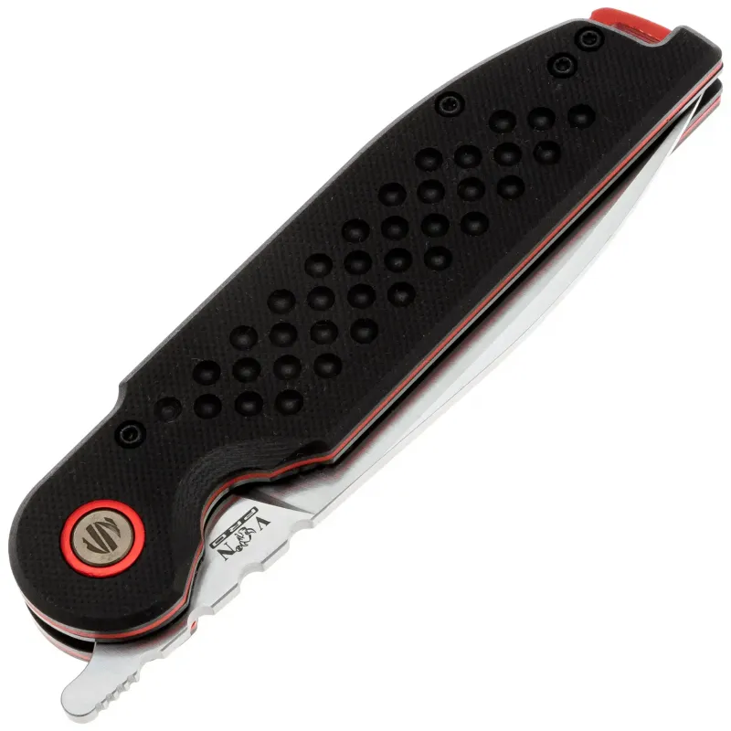 Рукоять из G10 имеет эргономичную форму и нескользящую текстуру, что обеспечивает уверенный хват даже во влажных условиях. В конструкции предусмотрено отверстие под темляк. Клипса позволяет удобно и незаметно носить нож в кармане, а контрастные декоративные элементы придают модели фирменный характер.