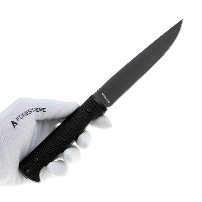 Клинок формы drop pint сочетает в себе мощный укол и хорошие режущие качества. Эта форма практична для универсального использования: от деликатной разделки до грубой силовой работы. Сталь AUS-8 — нержавеющая японская легированная сталь. Она славится хорошим удержанием заточки, коррозионной стойкостью и простотой в обслуживании — отличный выбор для полевого ножа. Клинок покрыт черным титановым напылением, что не только добавляет стильный вид, но и повышает устойчивость к царапинам и внешним воздействиям. Толщина клинка — внушительные 4 мм, что говорит о серьёзной прочности.