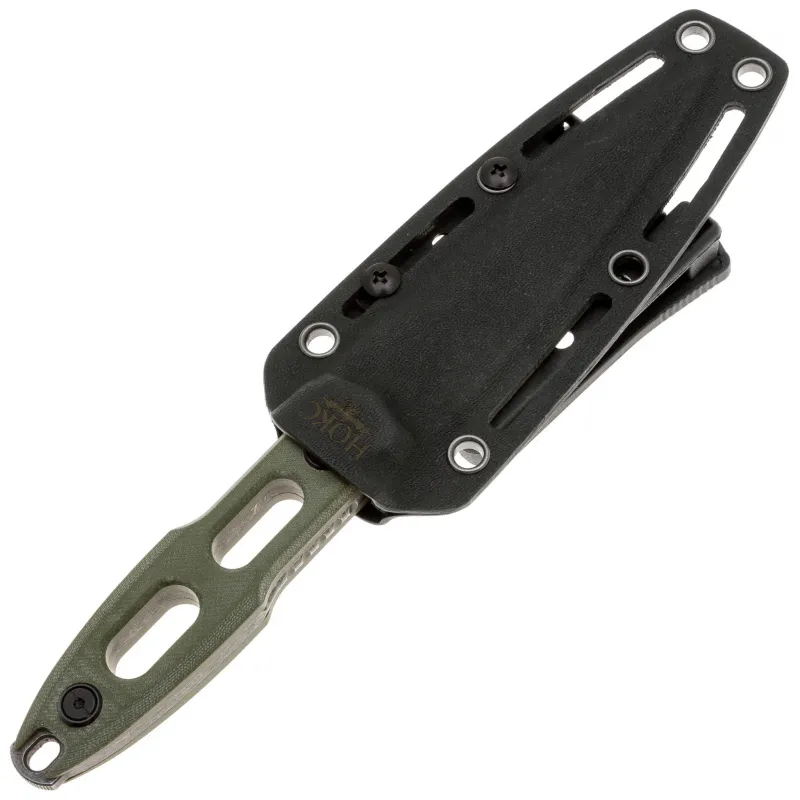 Рукоять ножа выполнена с использованием накладок из прочного стеклотекстолита G10. Этот материал не только обеспечивает надежный хват, но и устойчив к воздействию влаги и перепадам температуры, что делает нож подходящим для экстремальных условий. Скелетонизированная структура рукояти снижает вес конструкции, сохраняя при этом её прочность. Цельнометаллическая конструкция ножа обеспечивает выдающийся запас прочности и долговечности.