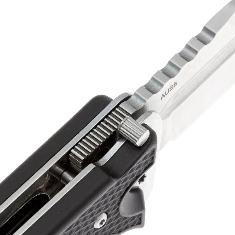 Клинок выполнен в форме drop-point — это одно из самых универсальных решений: он отлично колет и режет, а высокая прочность обуха даёт возможность использовать нож для тяжёлой работы. В качестве материала используется сталь D2, известная своей износостойкостью, твёрдостью и способностью долго держать заточку. Обработка клинка выполнена методом сатинирования, что придает ему характерную штриховку, улучшая внешний вид. Открытие — с помощью фронтфлиппера, клинок движется плавно благодаря фторопластовым шайбам в осевом узле. Надёжный замок liner lock чётко фиксирует клинок при работе, а дополнительный предохранитель обеспечивает безопасность при транспортировке.