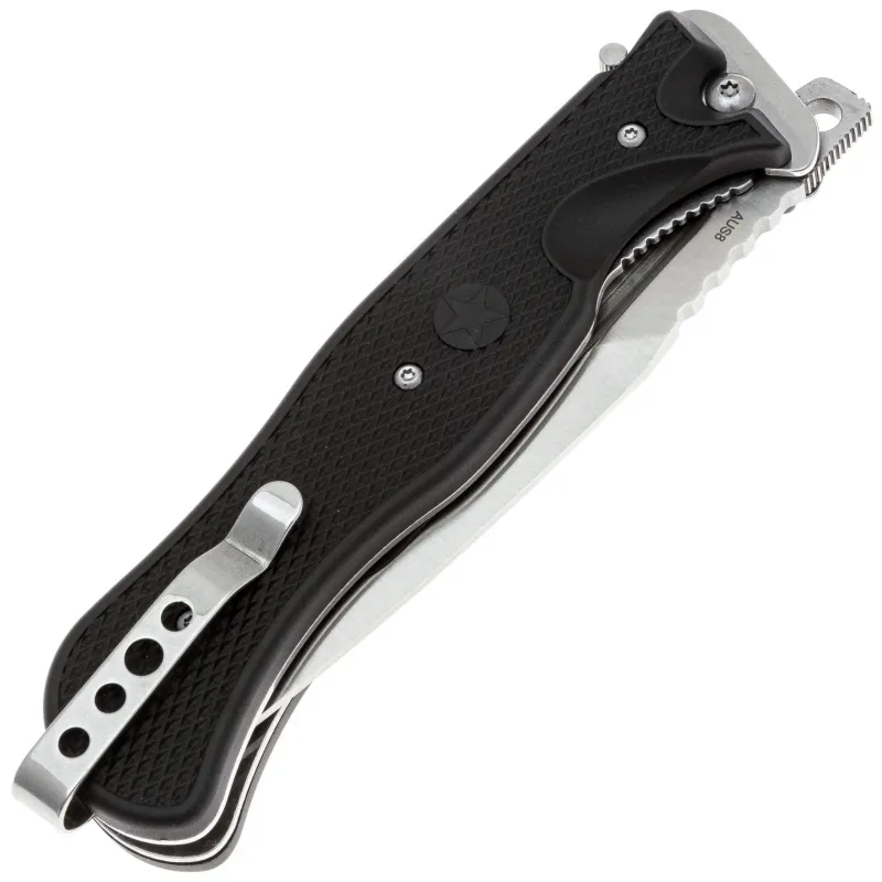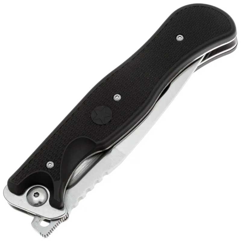 Конструкция рукояти с накладками из ABS-пластика с покрытием soft-touch. Такой материал не только приятен на ощупь, но и даёт уверенное сцепление с рукой даже во влажных условиях. ABS-пластик прочен, стоек к перепадам температуры и ударам. Эргономика рукояти продумана: нож удобно лежит в руке, обеспечивая надёжный хват. На рукояти установлена стальная клипса, которая позволяет носить нож с комфортом на кармане, поясе или снаряжении.