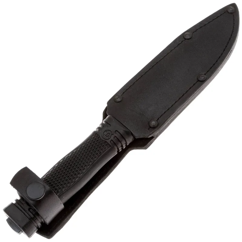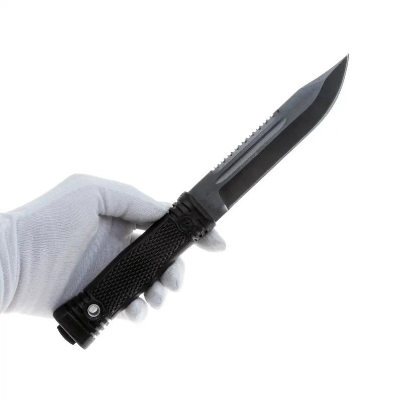 Рукоять изготовлена из прорезиненного пластика — недорогой и простой в изготовлении материал. Основное его достоинство — отличное сопротивление скольжению. Даже в воде он обеспечивает идеальный хват. Этот материал хорошо подходит для туристических ножей и ножей для дайвинга.