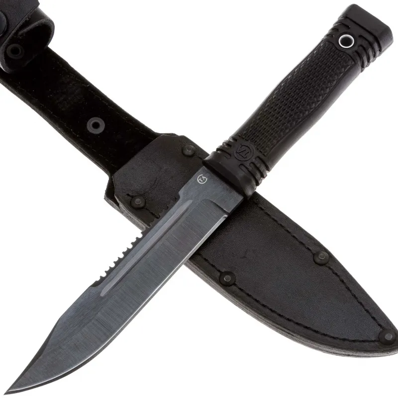 Клинок выполнен из простой рессорной стали 65г. Обладает хорошими режущими свойствами и повышенной износостойкостью, а также поддается оксидированию (воронению, чернению). Полоса или лист 65Г успешно применяются для изготовления ножей. В основном из этой стали изготавливают метательные ножи, реже — разделочные. Считается, что сталь 65Г один из самых дешевых материалов для изготовления ножей, так что ножи из этой стали будут делать еще долго.