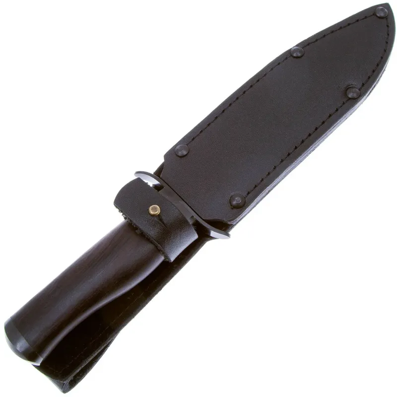 Рукоять изготовлена из древесины. Дерево является одним из самых традиционных и распространенных материалов для рукоятей ножей. Основным плюсом древесины является то, что, благодаря своей текстуре, она позволяет без особых усилий практически любую художественную форму рукояти. Традиционно используется на охотничьих ножах.