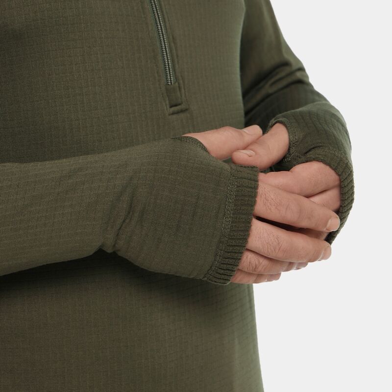 Водолазка на молнии позволит вам регулировать температуру во время подходов, а петли для большого пальца предотвратят скольжение рукавов вверх при надевании и снятии перчаток.