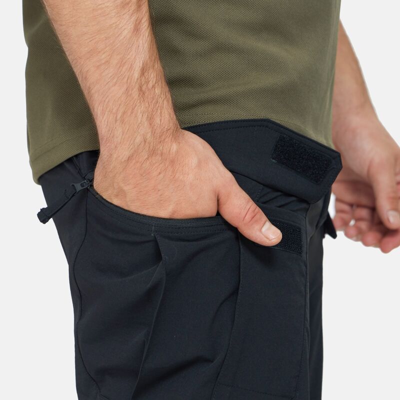 Конструкция брюк EIGER позволяет носить с собой все необходимое снаряжение, а анатомический крой не стесняет движений. Эластичный пояс и застежка на липучке позволяют регулировать размер. Большие петли для ремня позволяют использовать широкие ремни (шириной до 50 мм). Расположение карманов позволяет распределить нагрузку вблизи центра тяжести и вокруг бедер и талии. Края карманов усилены, чтобы выдерживать постоянное скольжение зажимов для фонарей и ножей. Два передних кармана на липучках достаточно велики, чтобы вместить смартфон или запасной магазин для винтовки (AK / AR). В набедренные карманы на молнии можно положить бумажник или небольшую сумку. Внутренние карманы на коленях позволяют использовать  низкопрофильные защитные накладки из неопрена.