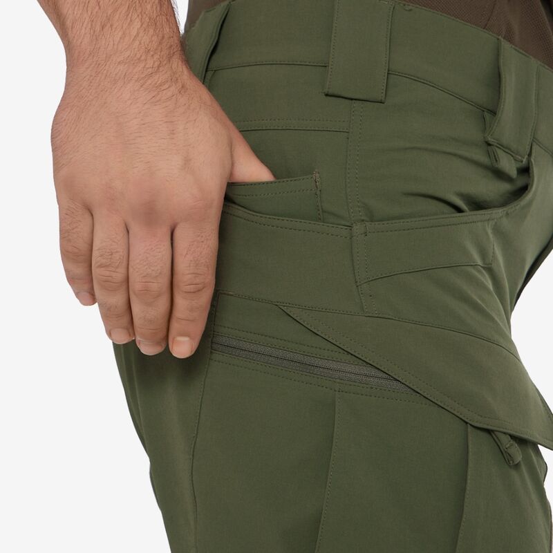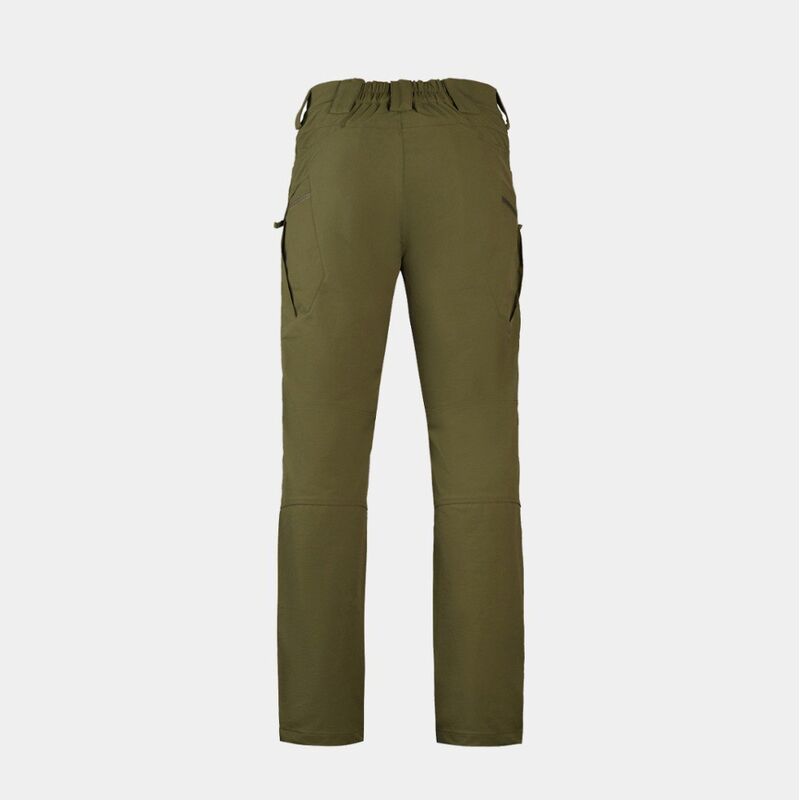 Конструкция брюк EIGER позволяет носить с собой все необходимое снаряжение, а анатомический крой не стесняет движений. Эластичный пояс и застежка на липучке позволяют регулировать размер. Большие петли для ремня позволяют использовать широкие ремни (шириной до 50 мм). Расположение карманов позволяет распределить нагрузку вблизи центра тяжести и вокруг бедер и талии. Края карманов усилены, чтобы выдерживать постоянное скольжение зажимов для фонарей и ножей. Два передних кармана на липучках достаточно велики, чтобы вместить смартфон или запасной магазин для винтовки (AK / AR). В набедренные карманы на молнии можно положить бумажник или небольшую сумку. Внутренние карманы на коленях позволяют использовать  низкопрофильные защитные накладки из неопрена.