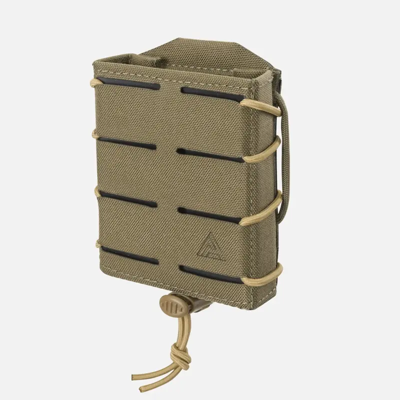 Внутренняя часть подсумка покрыта материалом Hypalon®, который усиливает трение и предотвращает случайную потерю магазина, даже если подсумок зацепится за препятствие. Отверстие размером с магнит и регулируемое крепление амортизационного шнура позволяют точно настроить силу захвата в соответствии с вашими предпочтениями.